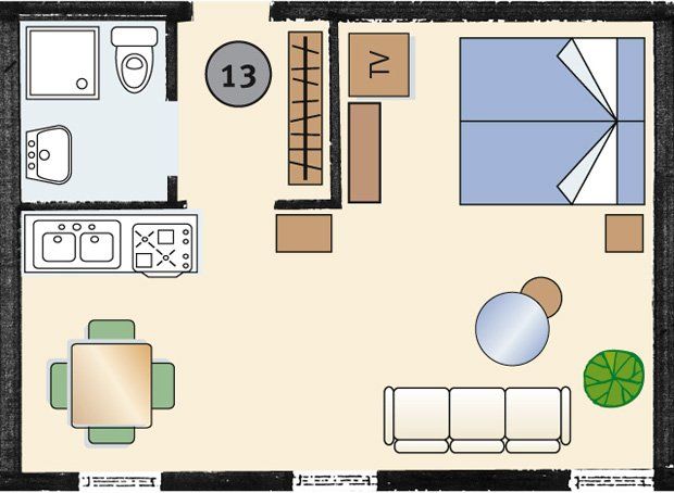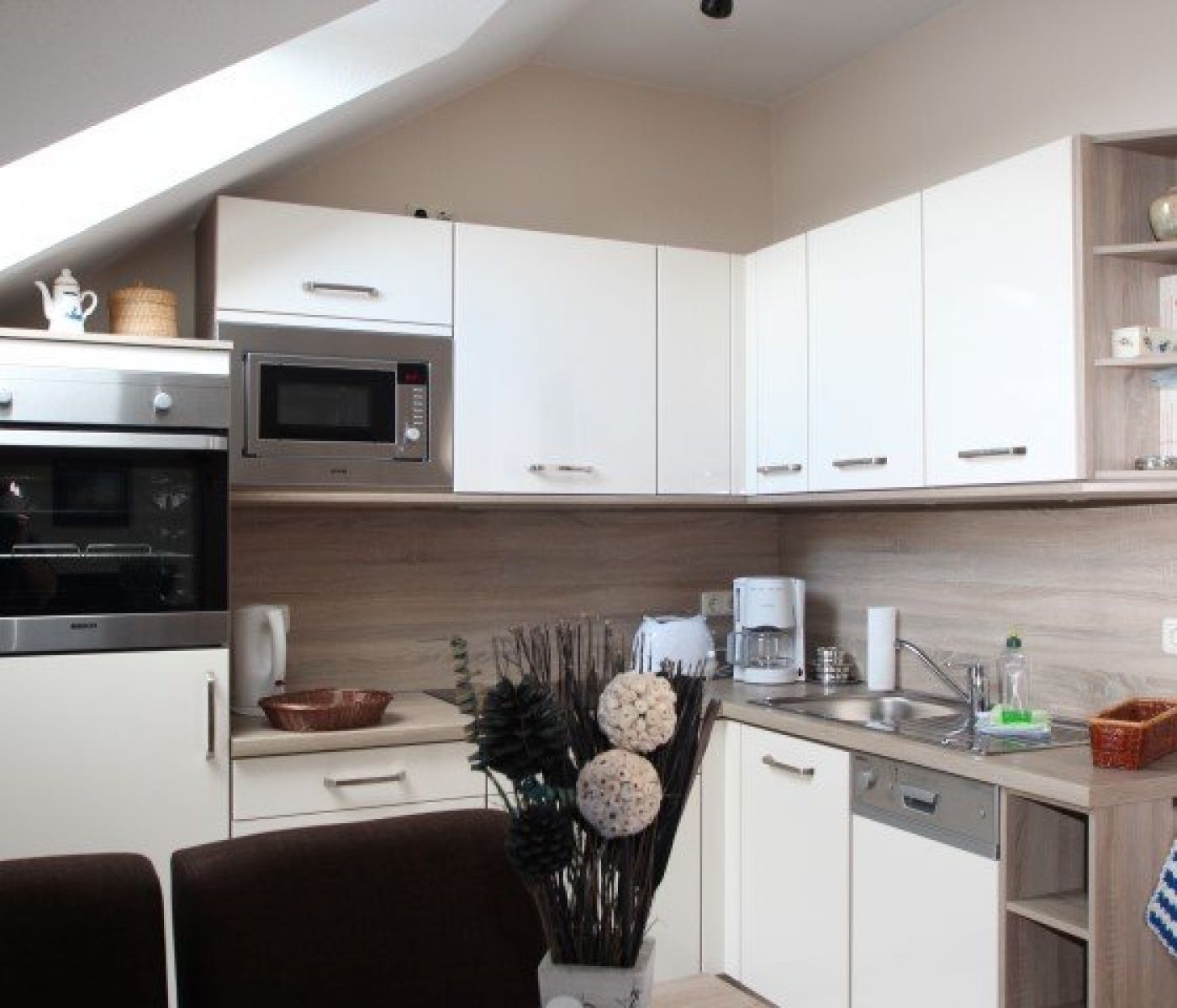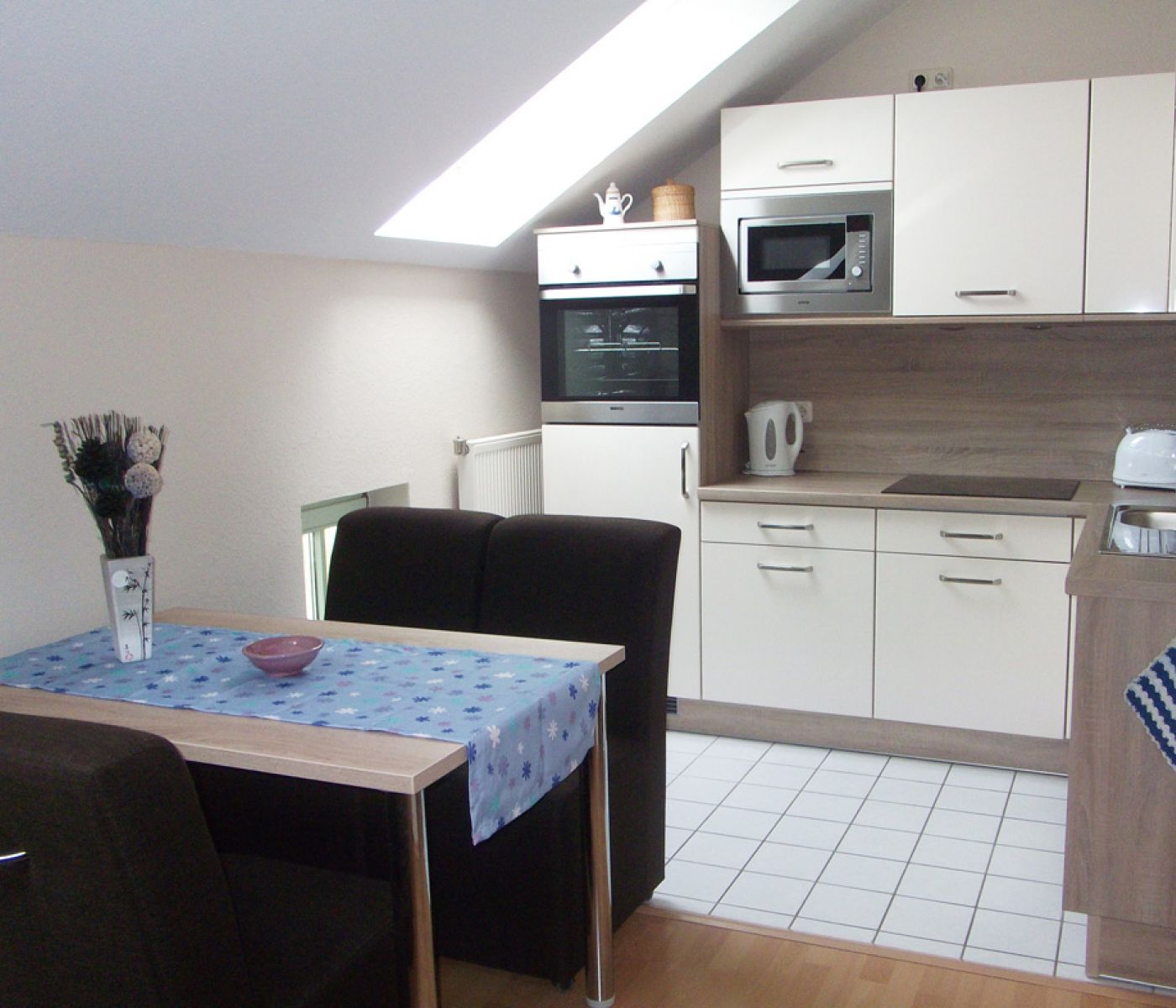 attraktiv eingerichtetes 1 Zimmerappartement im Dachgeschoss des Hauses für 1 bis 4 Personen. Doppelbett und Doppelbettcouch, Küche und Duschbad.