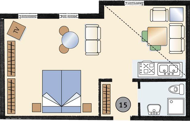 Im Landhausstil gemütlich eingerichtetes 1 Zimmerappartement mit bequemem Doppelbett und Doppelbettcouch für bis zu 3 Personen geeignet. Küche mit Sitzecke und Bad mit Dusche“.